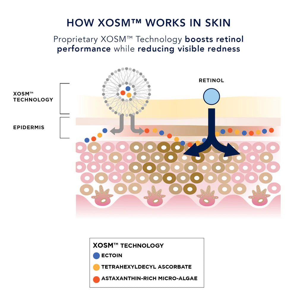 - XOSM™ Technology: This proprietary, patent-pending technology boosts the performance of retinol while protecting and nourishing the skin’s barrier with smart-encapsulated antioxidants ectoin, vitamin C and astaxanthin-rich micro-algae.